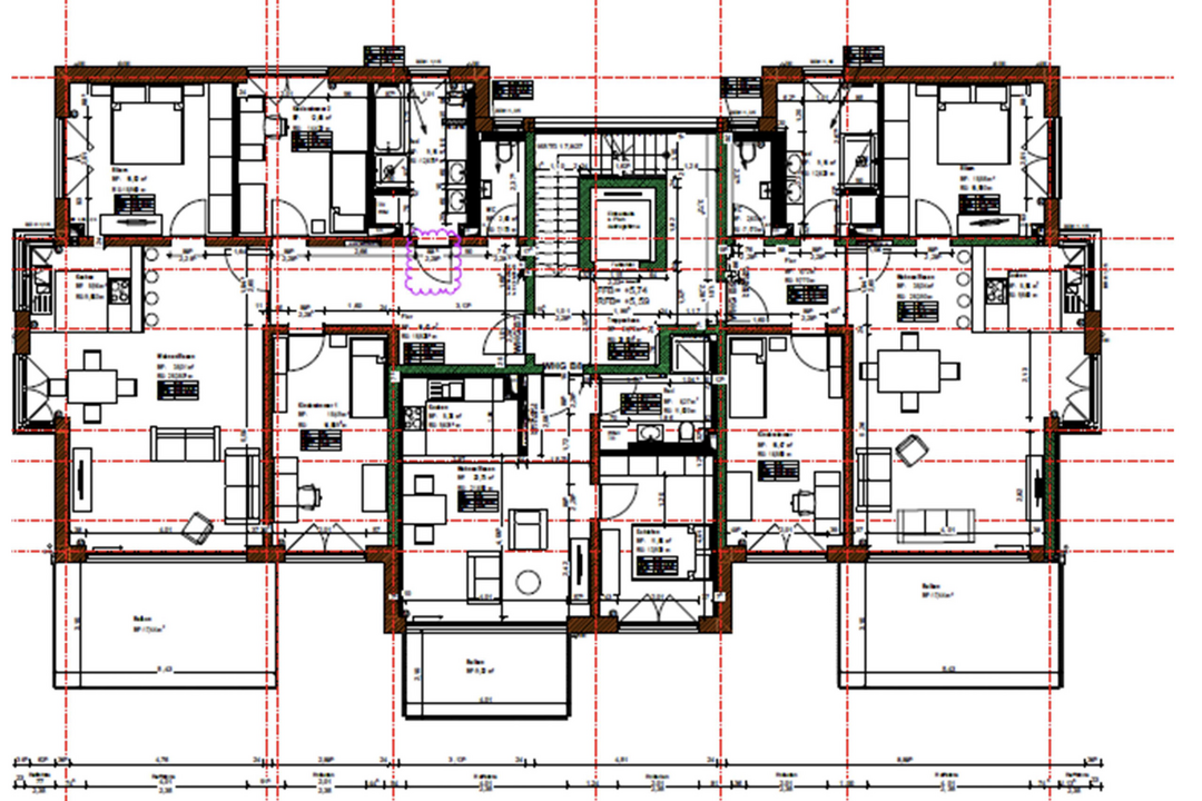 für einen Kunden (Investor) in Ortsrandlage von Bürgermoos 4 nahezu baugleiche Mehrfamilienhäuser mit je 11 Wohnungen zu erstellen. Die Projektübergabe erfolgte im Zuge der Baugenehmigung, Werkplanung und Fachingenieurleistungen (Statik, EneV, HLS, Elektro, etc.) waren Teil der Aufgabenstellung und im Gesamtauftrag enthalten. Errichtet auf einer großen, gemeinsamen Tiefgarage mit insgesamt 51 Stellplätzen. Zum nachhaltigen Korrosionsschutz des Stahlbetons wurde ein spezielles Beschichtungssystem aufgebracht.